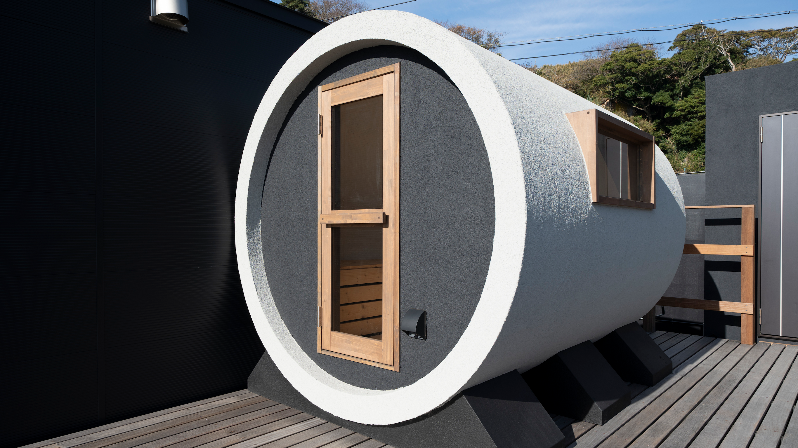 リビング棟と寝室棟の2つのトレーラーハウスからなる客室の敷地面積は約80㎡。さらにウッドデッキには専用のプライベートサウナとジャグジーを設置しました。
